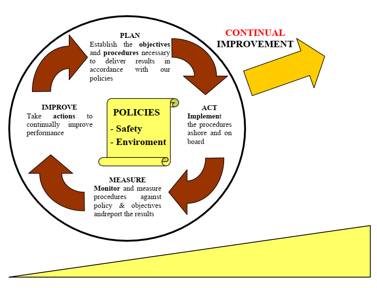Policy statement contains the high level but long term goals and aspirations, such as zero spills and zero incidents which are obtained through the following model for continuous improvement: